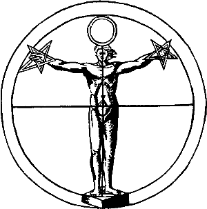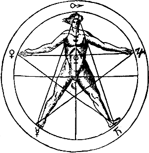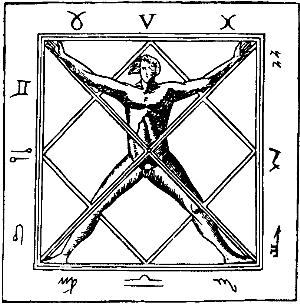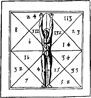 Dokonale souměrné lidské tělo je však i tvaru čtvercového, neboť postaví-li se člověk zpříma a rozpaží-li ruce, tvoří čtverec, jehož střed spadá v kost stydkou. Opíšeme-li kolem tohoto těla temenem kružnici a spustíme-li ruce tak hluboko, abychom se dotýkali prsty kružnice, a postavíme-li se rozkročmo, aby vzdálenost mezi chodidly na kružnici rovnala se vzdálenosti konečků prstů na ruce od temene, rozdělíme kruh na 5 stejných dílů a sestrojíme dokonalý pětiúhelník, jakož i rovnostranný trojúhelník, spojíme-li čarami obě paty s pupkem.